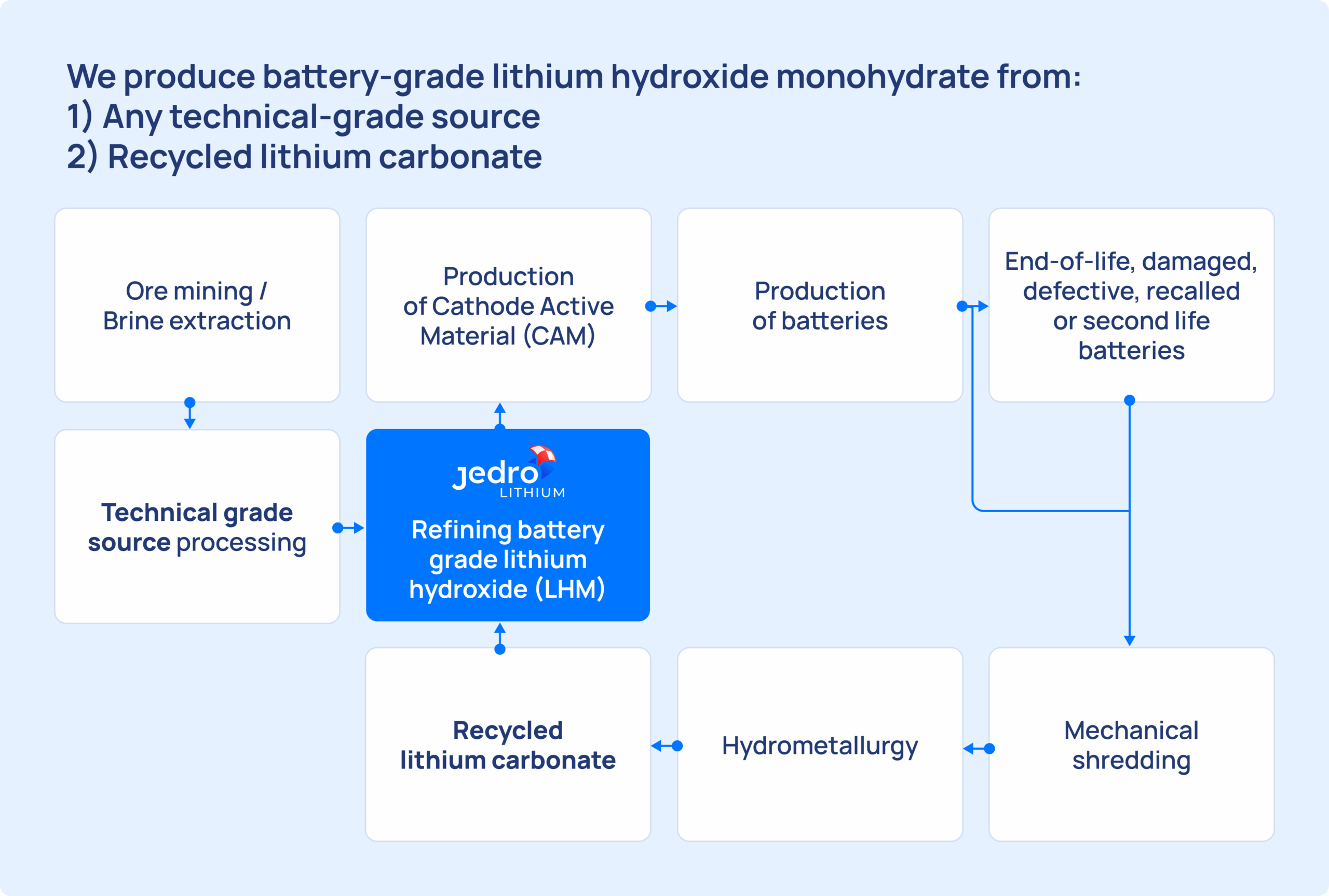 With an initial production capacity of 12,500 tpa of battery-grade lithium hydroxide monohydrate, Jedro Lithium is poised to make a significant impact on Europe’s supply chain. Built on the expertise of specialists in lithium hydroxide refining for the battery industry, we leverage proven and effective methods to produce high-quality lithium hydroxide monohydrate from both recycled and technical-grade lithium carbonate.